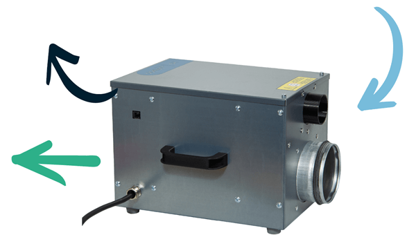 Avfuktaren placeras i det utrymme som ska avfuktas eller utanför med hjälp av tillbehör. Våtgasslangen (50 mm) förs ut ur det betjänade utrymmet och ansluts till utloppsplåten som monteras på utsidan av väggen.